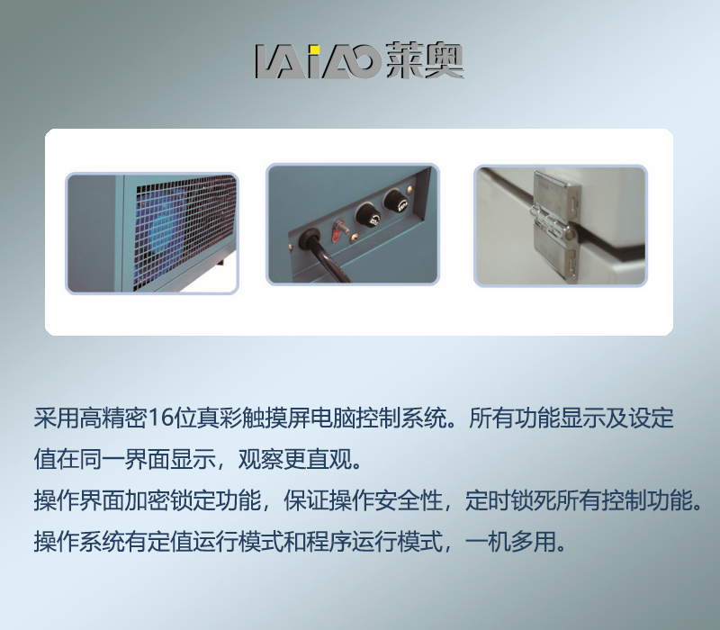 l采用16位真彩触摸屏电脑控制系统。所有功能显示及设定值在同一界面显示,观察更直观。